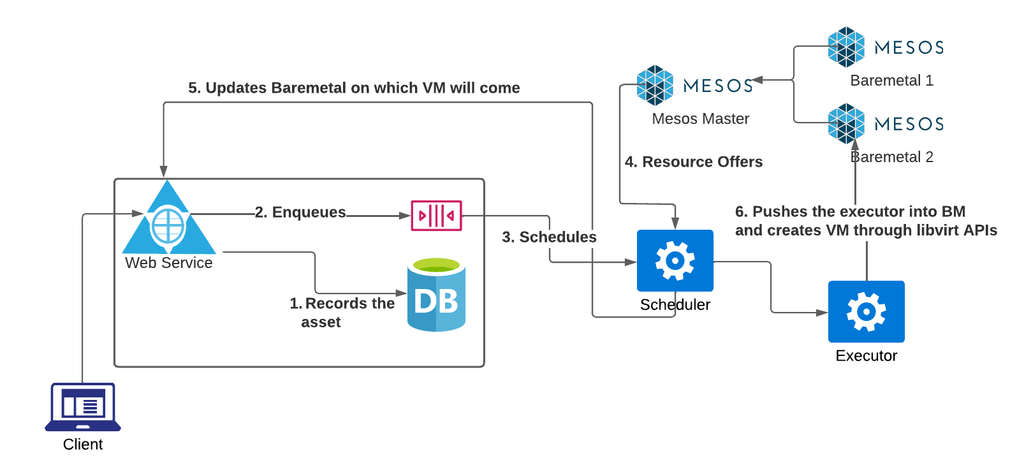 PPEC uses KVM along with libvirt + QEMU, using Mesos as a “placement” coordinator. A mesos cluster, that has all the participating baremetals as a team specific cluster, will be used to place VMs on those baremetals, through Mesos’ visibility. A higher level flow is captured in the image below: