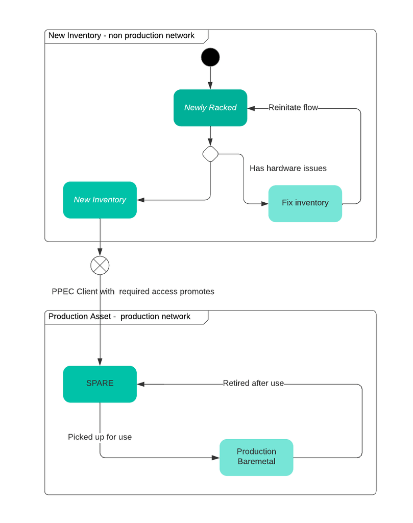 PPEC uses a provisioning flow that uses its own PIOUS to initialize any new asset in a very fast and reliable way that ensures hardware integrity as well as Inventory characteristics validation. This OS helps in transitioning an asset from a SPARE to a production worthy BAREMETAL that contains hardened images. A higher level flow is captured in the image below: